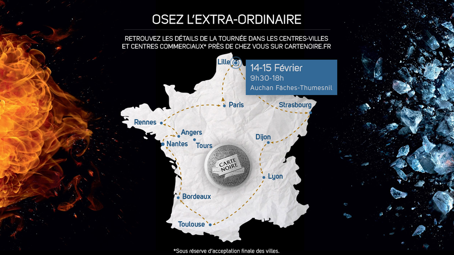 Carte Noire introduced the origin of its coffee through the “Fire and Ice” brand activation. The challenge was to create an interactive Kinect-based game alongside a digital outdoor experience that could travel across France and engage audiences in a public setting.